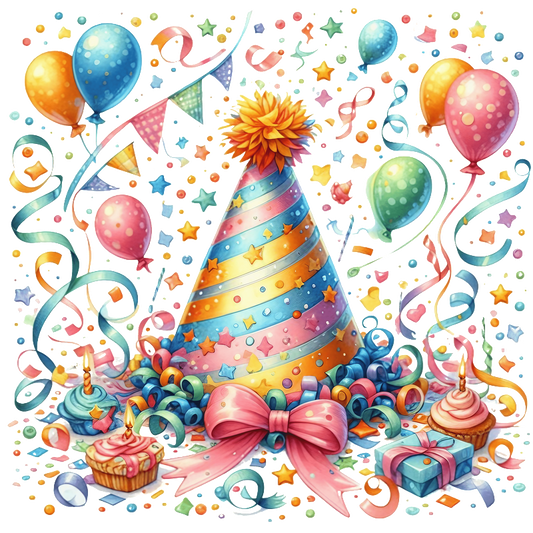 Celebrate in style with this vibrant party scene featuring a colorful party hat, balloons, festive ribbons, and delicious treats!DTF Transfers