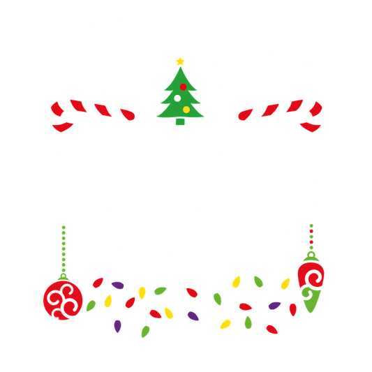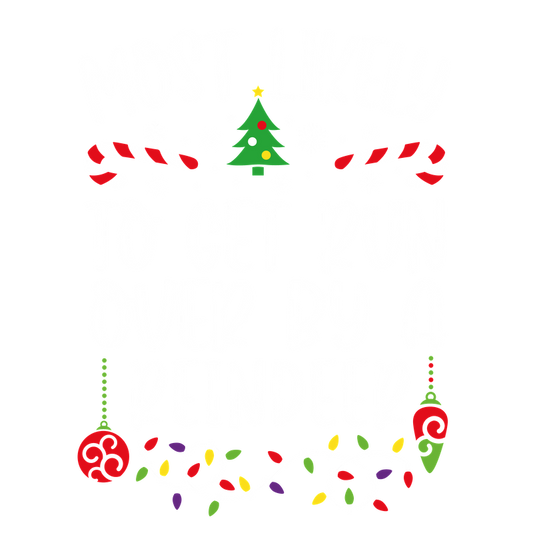 A festive and humorous design featuring the phrase "Most Likely to Get Run Over by a Reindeer," surrounded by holiday decorations.DTF Transfers dtf prints