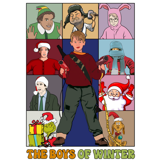 A colorful collage titled "The Boys of Winter" featuring various festive characters and iconic figures in a playful cartoon style.DTF Transfersdtf regular iron heat press transfers