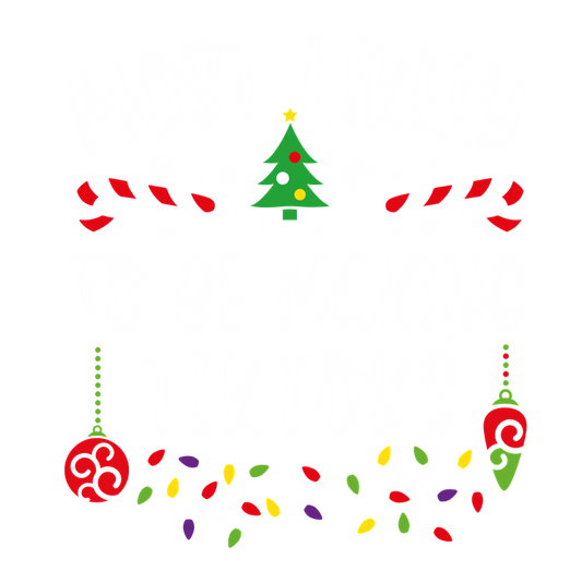 A festive design featuring the playful text "Most Likely to Be Making TikToks," surrounded by holiday decorations like candy canes and lights.DTF Transfers heat press transfers dtf prints