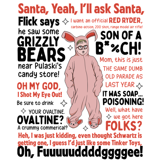 A humorous design featuring a character in a rabbit onesie, with playful quotes referencing a classic holiday movie and nostalgic gifts.DTF Transfers dtf prints