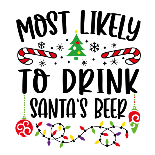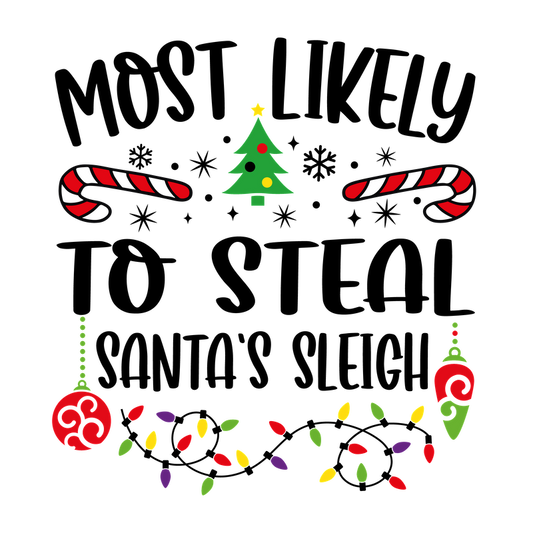 A festive and humorous design featuring the phrase "Most Likely To Steal Santa's Sleigh," decorated with candy canes, lights, and holiday elements.DTF Transfersdtf regular irondtf regular iron