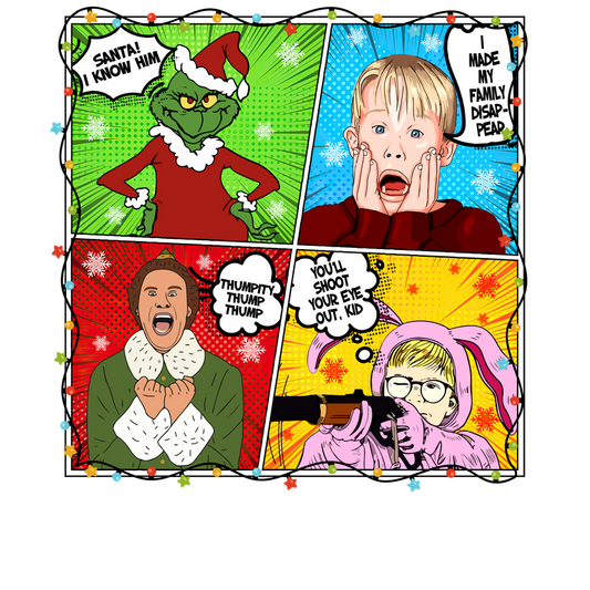 Regular price From £0.75 GBPRegular priceUnit price / per£2.39 GBPSale price From £0.75 GBPA colorful comic-style illustration featuring iconic characters in humorous holiday scenarios, including the Grinch and a playful child.DTF Transfers dtf prints