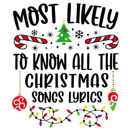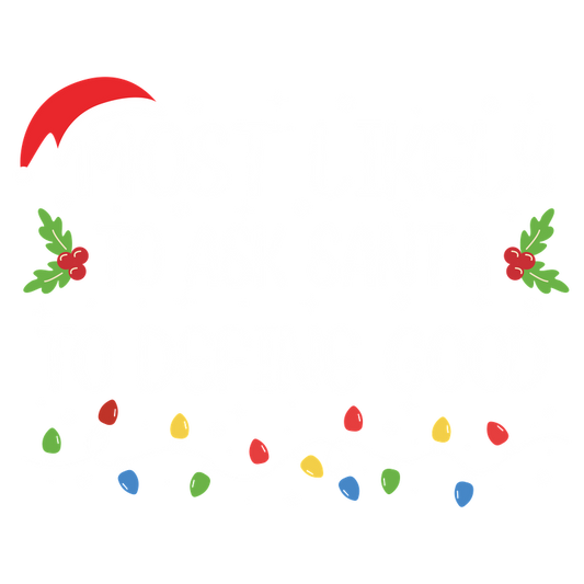 A festive design featuring the playful phrase "Most Likely to Ask Santa to Define Good," adorned with holly and colorful lights.DTF Transfersdtf regular iron heat press transfers