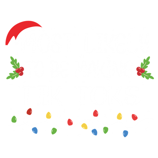 Regular price From £0.75 GBPRegular priceUnit price / per£2.39 GBPSale price From £0.75 GBPFestive design featuring the phrase "Most Likely to Be Making Tik Toks," adorned with holiday elements like a Santa hat and Christmas lights.DTF Transfers heat press transfers heat press transfers