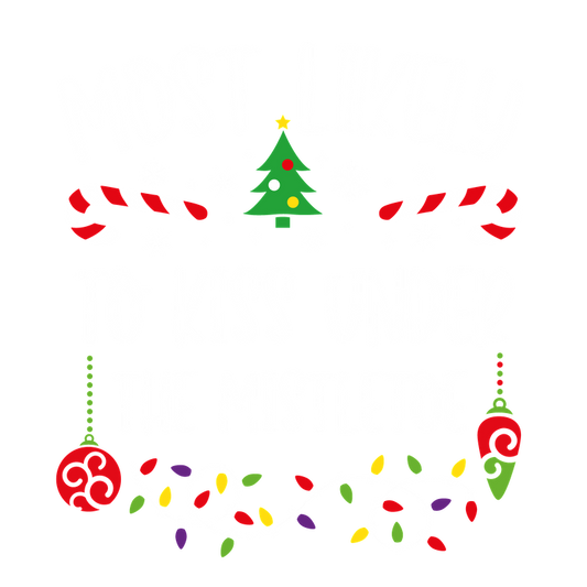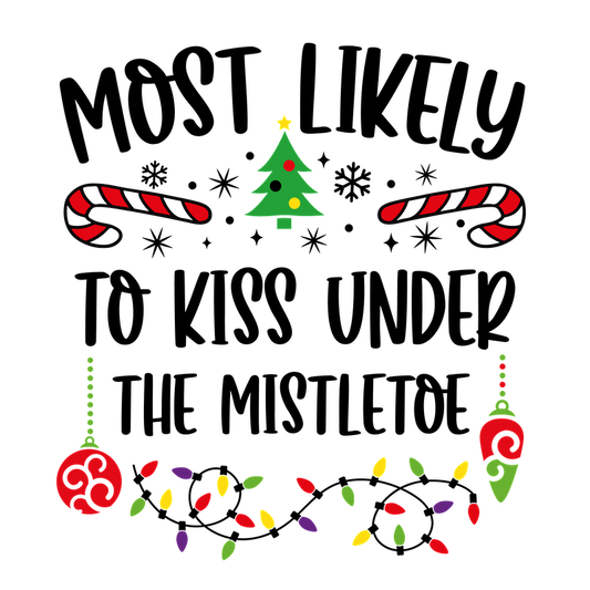 Celebrate the season with this festive design proclaiming "Most Likely to Kiss Under the Mistletoe," decorated with cheerful holiday elements!DTF Transfers dtf transfersdtf regular iron