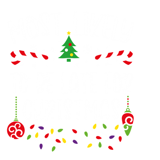 Celebrate the holiday spirit with this playful design proclaiming "Most Likely to Be Late for Christmas," adorned with festive elements!DTF Transfers heat press transfersdtf regular iron