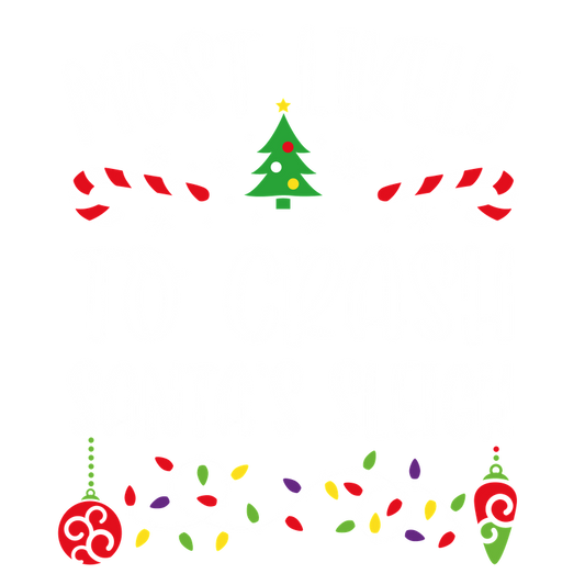 Celebrate the holidays with this fun and playful design proclaiming "Most Likely to Crash Santa's Sleigh," adorned with festive decorations!DTF Transfers heat press transfersdtf regular iron heat press transfers