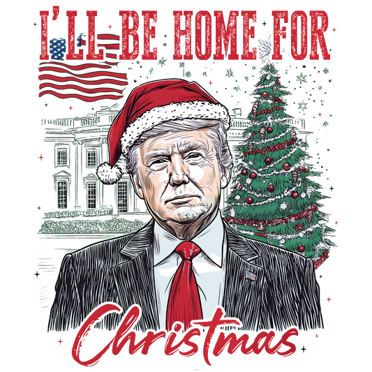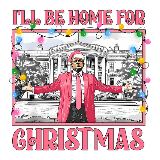 A festive illustration featuring a person in a pink suit and Santa hat, with colorful lights and the text "I'll Be Home for Christmas."DTF Transfersdtf regular iron heat press transfers