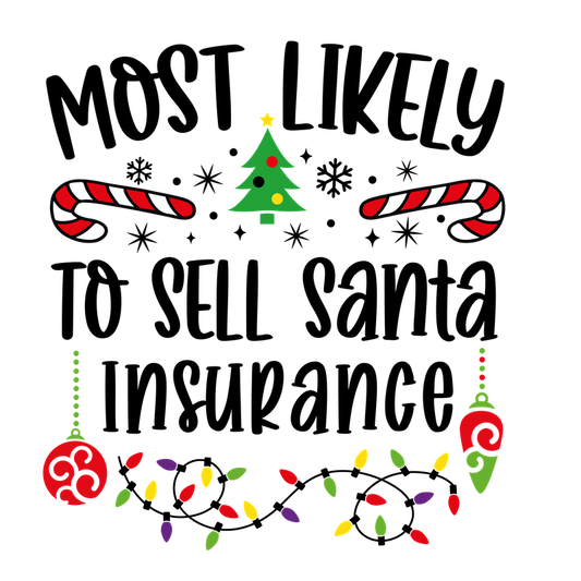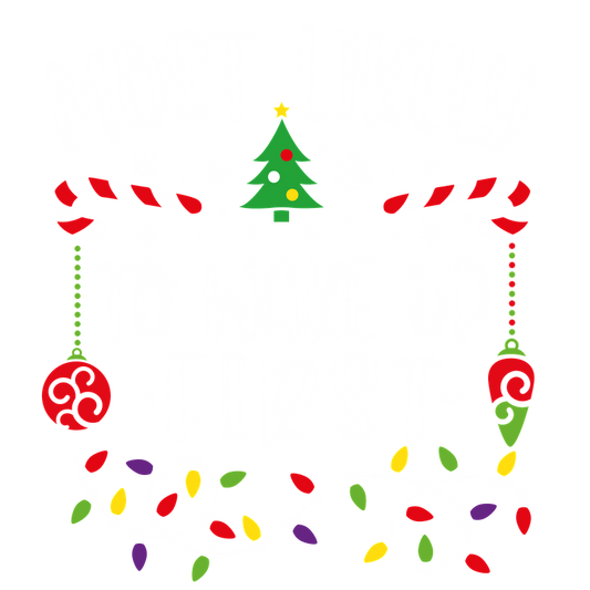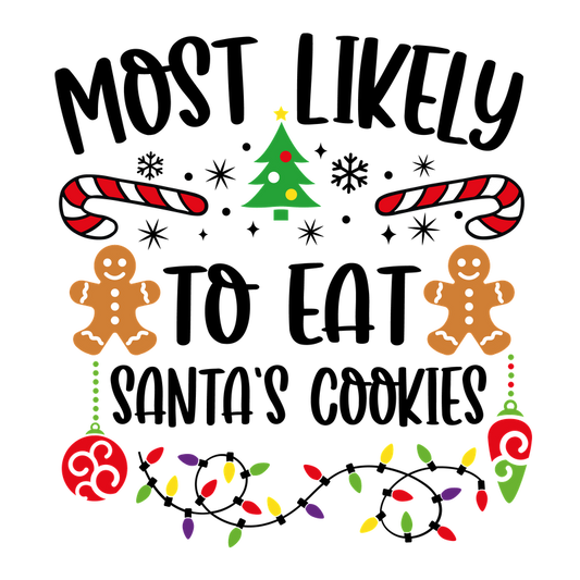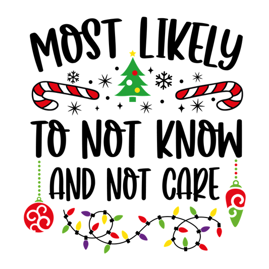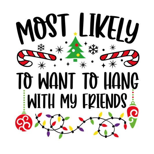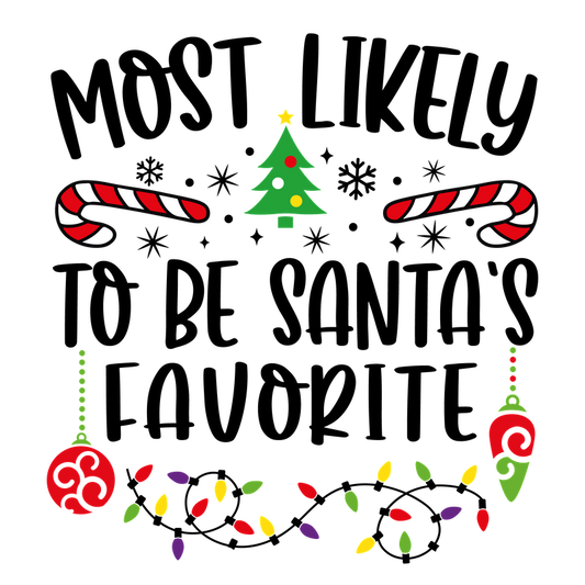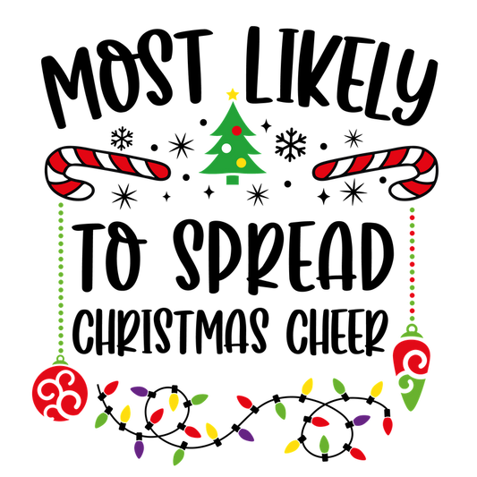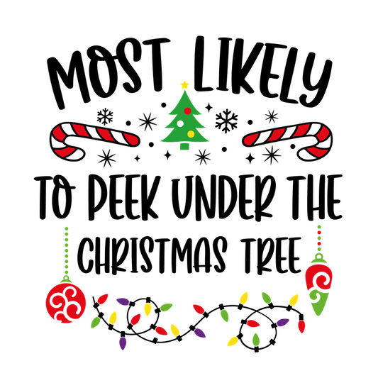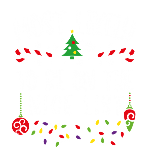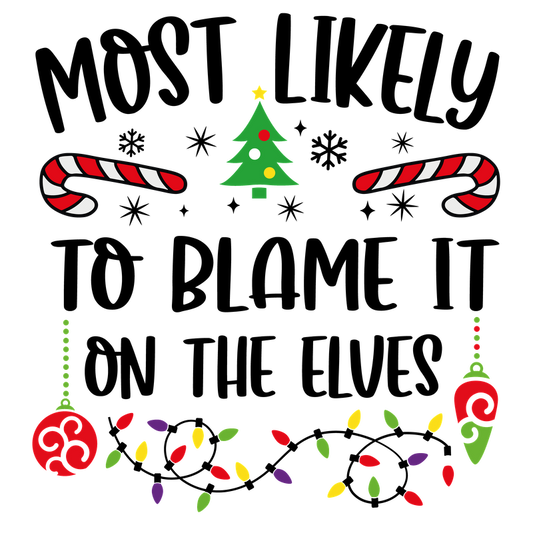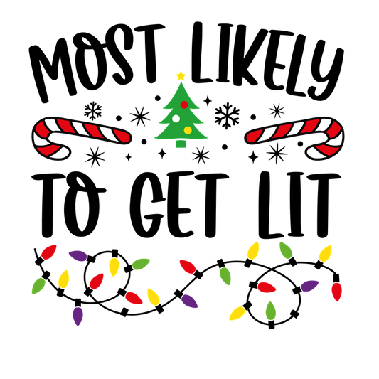 A festive design featuring the phrase "Most Likely" surrounded by Christmas elements like candy canes, a tree, and colorful lights.DTF Transfers dtf transfersdtf regular iron