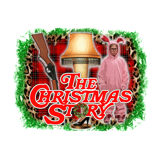 A colorful graphic tribute to "The Christmas Story," featuring iconic elements like a pink bunny suit, a lamp, and a rifle.DTF Transfers dtf transfersdtf regular iron