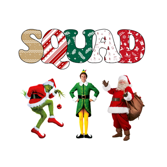 A festive trio featuring the Grinch, an elf, and Santa, all celebrating the holiday spirit with "SQUAD" in colorful letters.DTF Transfers dtf transfers heat press transfers