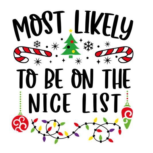 Celebrate the holiday spirit with this cheerful design featuring festive ornaments and the fun message, "Most Likely To Be On The Nice List."DTF Transfers heat press transfers heat press transfers