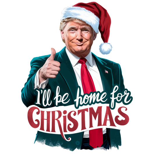 A festive graphic featuring a person in a suit and Santa hat, with the text "I'll be home for Christmas."DTF Transfers heat press transfers dtf transfers heat press transfers