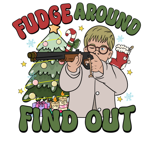 Regular price From £0.75 GBPRegular priceUnit price / per£2.39 GBPSale price From £0.75 GBPThis playful graphic features a child holding a firearm in front of a decorated Christmas tree, captioned "Fudge Around Find Out."DTF Transfers dtf prints
