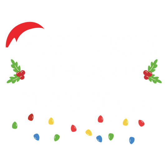 This festive design features the playful phrase “Most Likely to Climb the Roof to See Santa,” adorned with holiday lights and holly.DTF Transfers heat press transfers