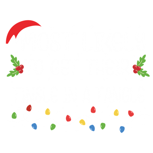 Celebrate the holiday spirit with this playful design featuring the phrase "Most Likely to Get Their Tinsel in a Tangle," adorned with festive decorations and lights.DTF Transfersdtf regular iron dtf prints