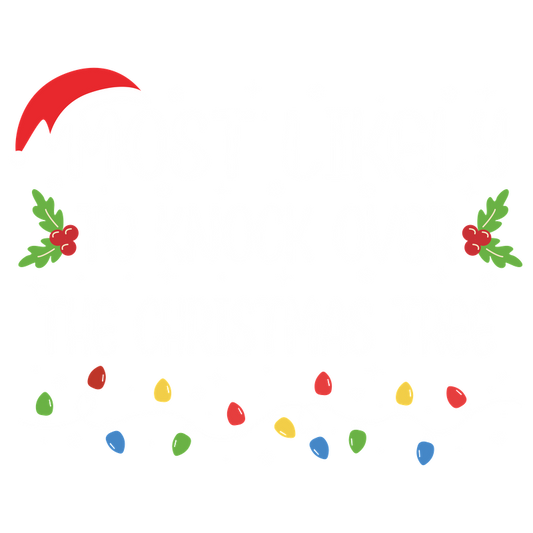 A festive design featuring playful text that reads "Most Likely to Knock Over the Christmas Tree" adorned with holiday decorations.DTF Transfers dtf prints