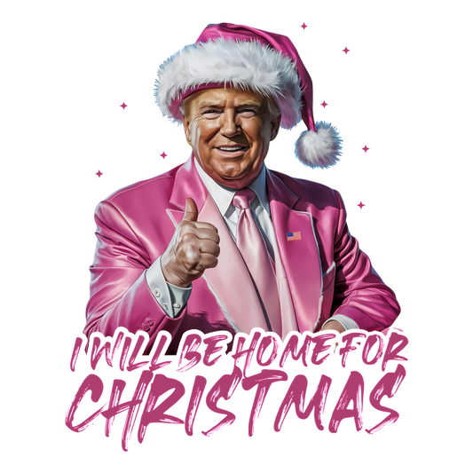 A festive design featuring a character in a pink suit and Santa hat, giving a thumbs-up with the phrase "I Will Be Home for Christmas."DTF Transfers heat press transfers dtf transfers