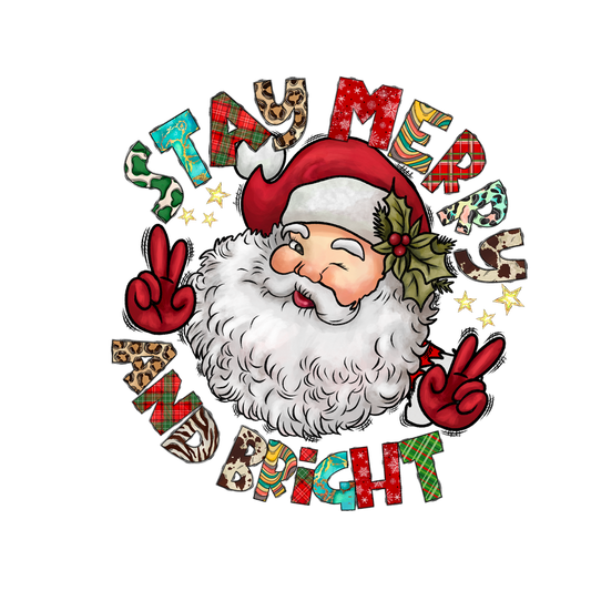 A cheerful Santa with a fluffy beard and festive attire, surrounded by the playful phrase "Stay Merry and Bright."DTF Transfers dtf transfersdtf regular iron