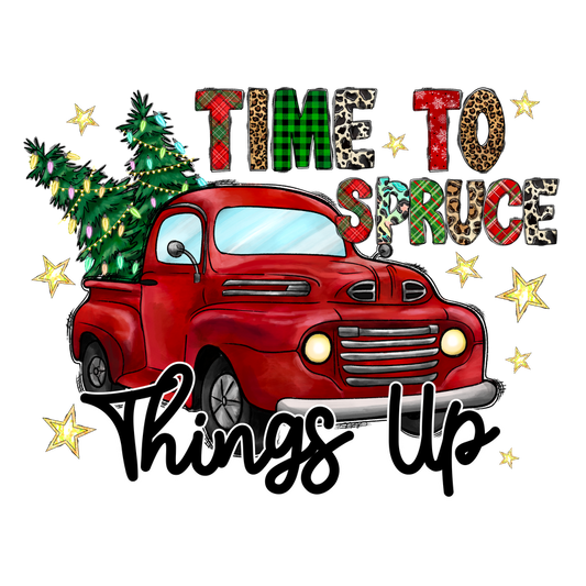 A cheerful red vintage truck carries a festive Christmas tree, surrounded by colorful text and decorative stars, perfect for the holiday season.DTF Transfers heat press transfers heat press transfers