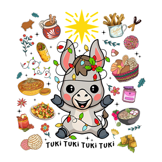 Regular price From £0.75 GBPRegular priceUnit price / per£2.39 GBPSale price From £0.75 GBPA cheerful cartoon donkey adorned with festive lights surrounded by a variety of delicious foods and colorful decorations.DTF Transfers dtf prints