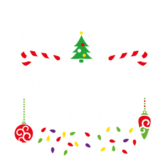 A playful holiday design featuring the phrase "Most Likely to Not Know and Not Care," adorned with festive elements like candy canes and Christmas lights.DTF Transfers heat press transfers dtf transfers