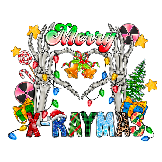 Celebrate the season with this playful "Merry X-Raymas" graphic featuring festive skeleton hands, holiday gifts, and cheerful decorations!DTF Transfers dtf prints