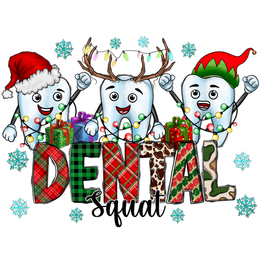 Celebrate the festive spirit with cheerful cartoon teeth in holiday attire, surrounded by gifts, lights, and snowflakes!DTF Transfers dtf transfersdtf regular iron