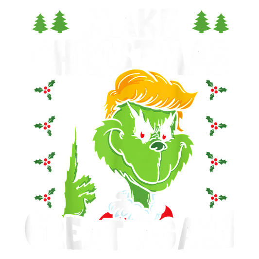 A playful illustration featuring the Grinch with a quirky hairstyle, promoting the message to "Make Christmas Great Again" amid festive decorations.DTF Transfers heat press transfersdtf regular iron