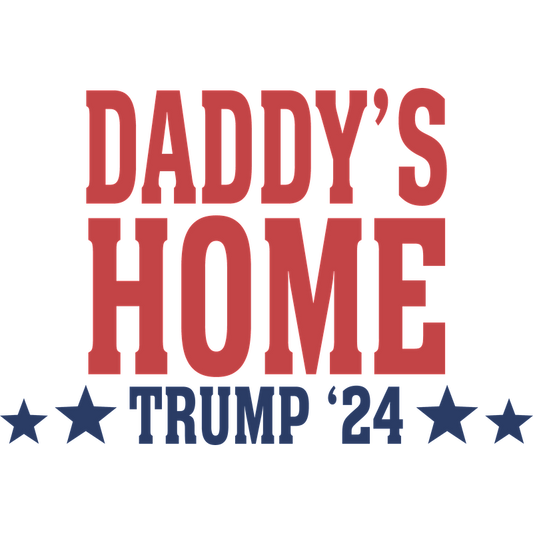 A bold graphic design featuring the phrase "Daddy's Home" alongside "Trump '24," complemented by star accents.DTF Transfers dtf prints
