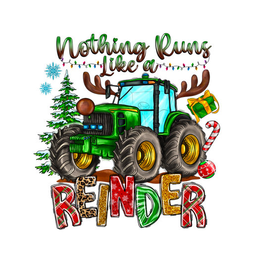 A festive and playful design featuring a green tractor with reindeer antlers, surrounded by holiday elements and whimsical text.DTF Transfers dtf transfers dtf transfers