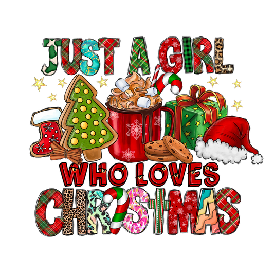 Celebrate the holiday spirit with this festive design featuring a girl who loves Christmas, complete with cookies, gifts, and decorations!DTF Transfers dtf prints