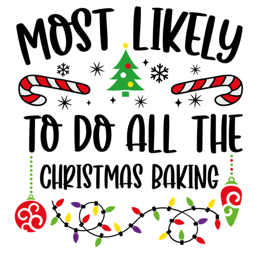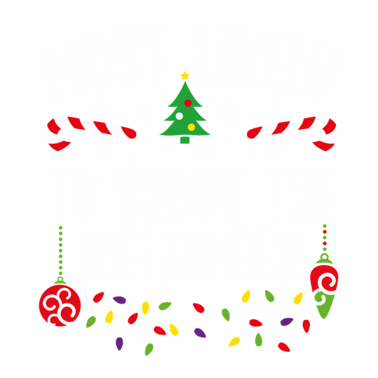 Get in the festive spirit with this playful holiday design featuring candy canes, ornaments, and the humorous phrase "Most Likely to Shoot the Reindeer."DTF Transfers dtf transfers dtf transfers