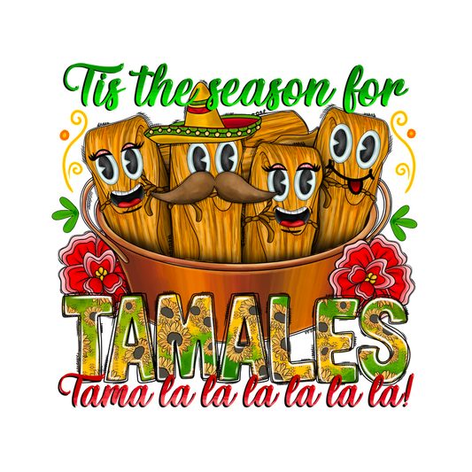 A festive illustration celebrating tamales, featuring cute animated tamales wearing hats and mustaches with the phrase "Tis the season for tamales!"DTF Transfers heat press transfers dtf prints