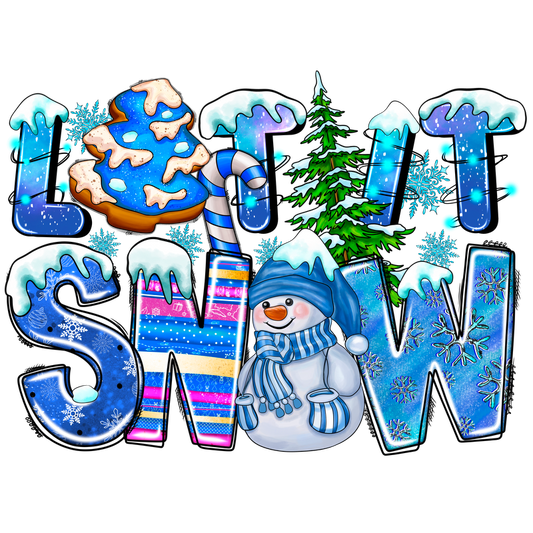 This vibrant winter-themed illustration features playful letters spelling "LET IT SNOW" adorned with snow, a cheerful snowman, and festive trees.DTF Transfersdtf regular iron