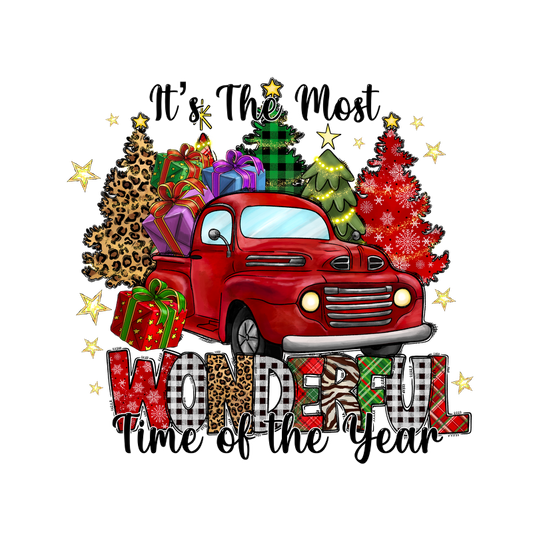 A cheerful red vintage truck adorned with colorful gifts, surrounded by festive elements, captures the spirit of the holiday season.DTF Transfers dtf transfersdtf regular iron