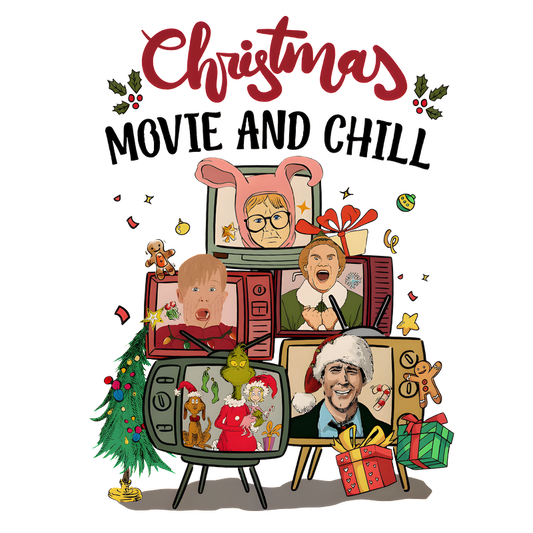 Cozy up for the holidays with this fun "Christmas Movie and Chill" graphic featuring retro TVs and festive characters!DTF Transfers dtf transfers dtf transfers