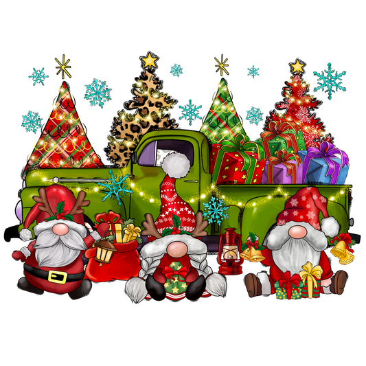 A cheerful holiday scene featuring playful gnomes, a vintage green truck, colorful wrapped gifts, and festive Christmas trees.DTF Transfers heat press transfers dtf prints