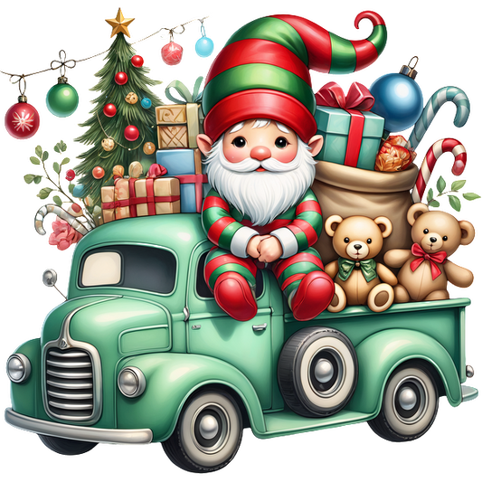 A festive green truck is filled with colorful gifts, a Christmas tree, and a cheerful elf holding teddy bears.DTF Transfers heat press transfers