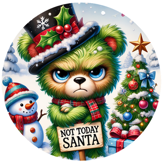 A grumpy green bear in a festive hat and scarf holds a sign saying "Not Today Santa," surrounded by holiday decorations.DTF Transfers dtf prints