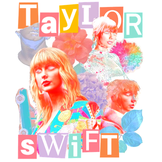 Regular price From £0.75 GBPRegular priceUnit price / per£2.39 GBPSale price From £0.75 GBPA vibrant and colorful collage featuring Taylor Swift, highlighted with artistic elements and bold text celebrating her name.DTF Transfers dtf prints