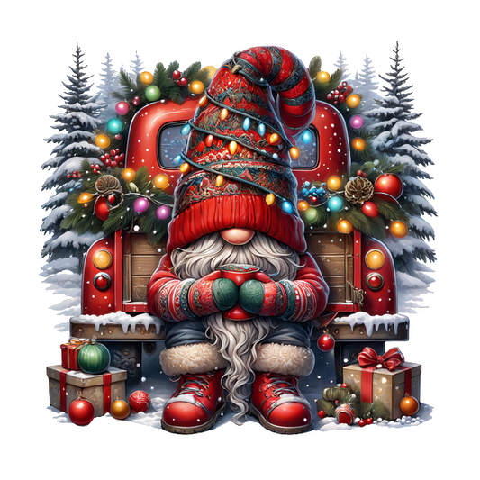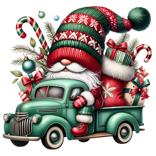 A cozy Christmas gnome in festive attire sits on a vintage truck, surrounded by colorful decorations, presents, and snowy trees.DTF Transfersdtf regular iron