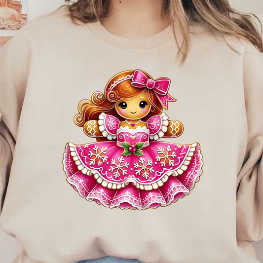 A cute gingerbread girl in a festive pink dress adorned with snowflakes and a bow, perfect for holiday decor.DTF Transfers dtf prints