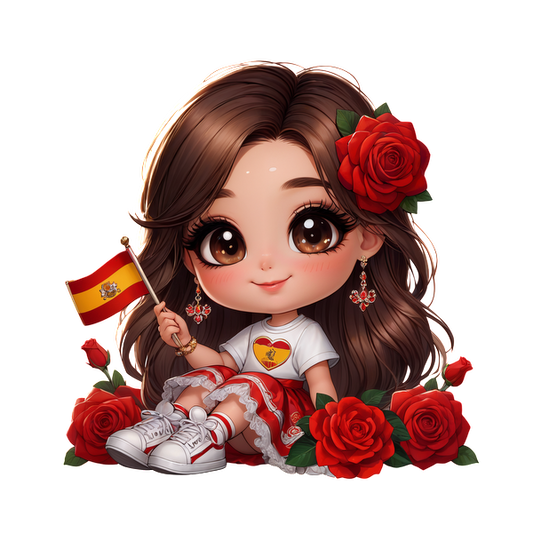 Regular price From £0.75 GBPRegular priceUnit price / per£2.39 GBPSale price From £0.75 GBPA charming, animated girl with long hair and a heart-themed shirt, holding a Spanish flag amidst vibrant red roses.DTF Transfers dtf transfers