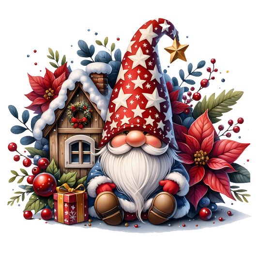Cheerful holiday gnome with a star-patterned hat sits near a cozy decorated house, surrounded by festive flowers and ornaments.DTF Transfers dtf prints