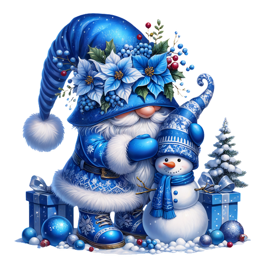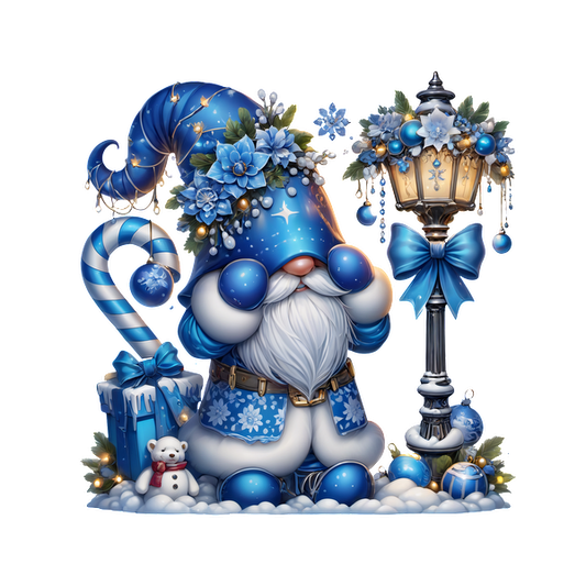 A cheerful winter gnome in a blue floral hat and coat, surrounded by gifts, a candy cane, and a lantern.DTF Transfers heat press transfers
