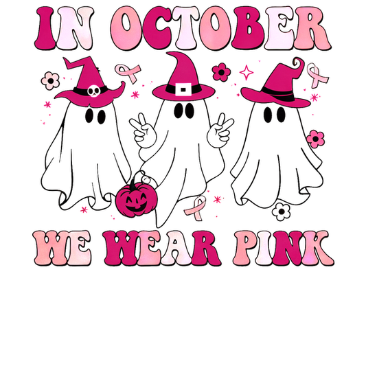 Celebrate October with a playful design featuring ghostly witches proclaiming, "In October, we wear pink!" Perfect for Halloween spirit!DTF Transfersdtf regular iron