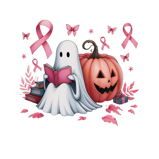 A cute ghost reading a book beside a carved pumpkin, surrounded by pink ribbons and butterflies, celebrating Halloween and awareness.DTF Transfers heat press transfers