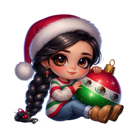 Regular price From £0.75 GBPRegular priceUnit price / per£2.39 GBPSale price From £0.75 GBPA cute girl in a Santa hat holds a vibrant Christmas ornament featuring the Mexican flag, showcasing festive cheer.DTF Transfers dtf transfers